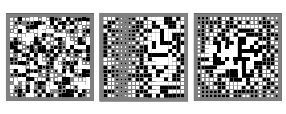 Tego typu wizualicja możę przedstwiać dane zawarte w dwuwymiarowej macierzy. Kwadraty skalowane są zgodnie z wartościami macierzy. Dodatkowo możemy wprowadzić kolorowanie kwadratów w oparciu o różne kryteria. Na rysunkach przestawiono losowe kolorowanie z użyciem dwóch kolorów.