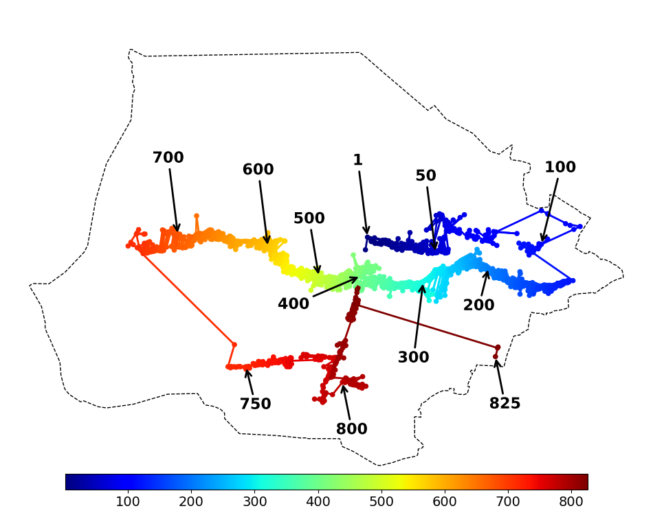 Wyobraźmy sobie, że wybieramy się na spacer po Bratkowicach. Chcemy przejść Bratkowice zgodnie z numeracją budynków, czyli od pierwszego domu aż po ostatni. Jak wyglądałaby taki spacer? W celu lepszego zobrazowania takiej drogi przypiszmy każdemu numerowi budynku pewien kolor począwszy od niebieskiego (początkowe numery) przez zielony, żółty aż po czerwony (końcowe numery). Przykład takiej drogi został przedstawiony na Rys. 6. Z kolorowego paska poniżej mapy możemy odczytać orientacyjny numer budynku. Zauważalne długie odcinki na wykresie narysowane cienką linią oznaczają, że jest do pokonania duża odległość między dwoma kolejnymi numerami. Taką sytuację mamy na przykład przy przejściu numeracji z Bugaju na Dąbry, czy też z okolic centrum Bratkowic w kierunku budynku PGR.