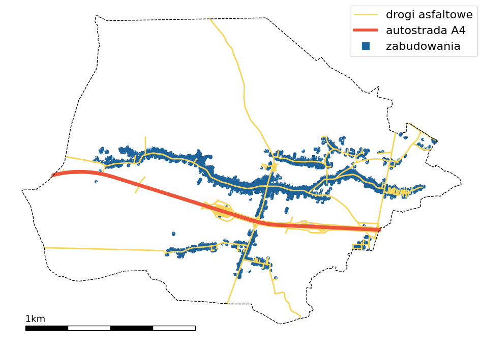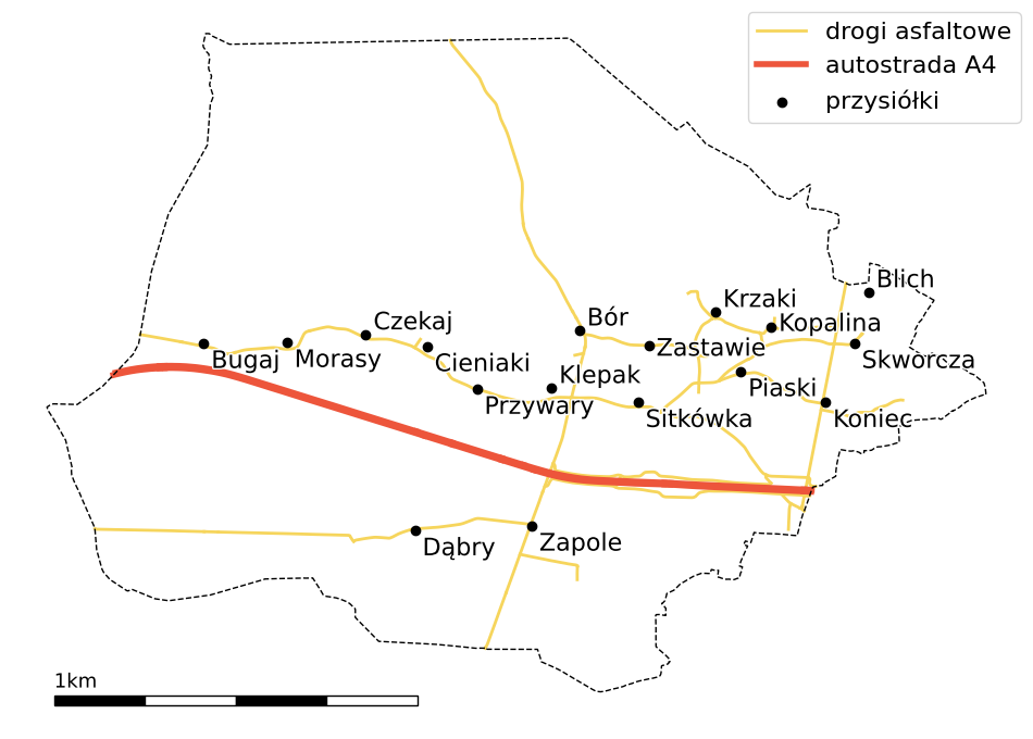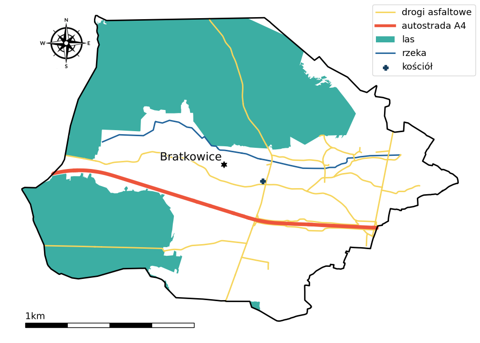 Wyślijmy więc pierwsze zapytanie aby uzyskać podstawowe dane odnośnie Bratkowic. Interesować nas będzie w pierwszej kolejności kształt, który określa obszar zajmowany przez Bratkowice, jak również występujące na tym obszarze lasy, drogi asfaltowe i rzeki. Uzyskane w ten sposób dane możemy zwizualizować dodając jak na mapę przystalo legendę, skalę, kompas i voilà - mapa gotowa (Rys. 1).