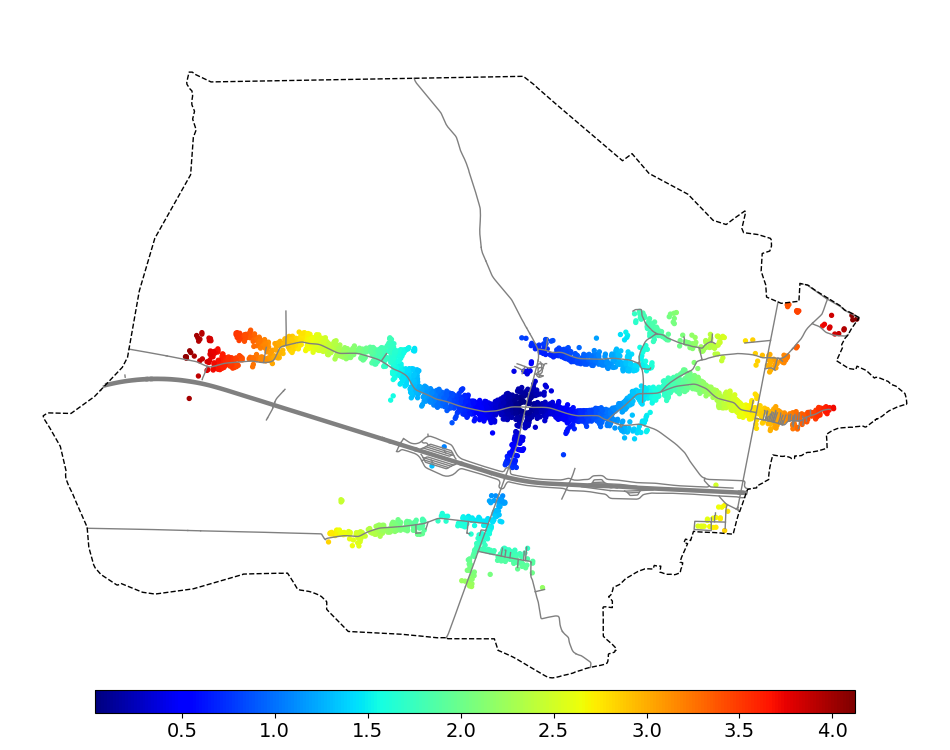 Zamiast rysowania okręgów możemy pokusić się o przedstawienie odległości od centrum Bratkowic w trochę inny sposób. Nanieśmy na mapę wszystkie budynki mieszkalne. Każdemu budynkowi przypiszmy pewien kolor, który będzie reprezentował odległość od centrum liczoną w linii prostej Rys. 10. Poszukując na mapie tych samych kolorów jesteśmy w stanie bardzo szybko określić jak daleko do centrum mają mieszkańcu poszczególnych domów. Wyraźnie widać że najdalej bo ponad 4km do pokonania mają mieszkańcy Bugaju i Blichu.