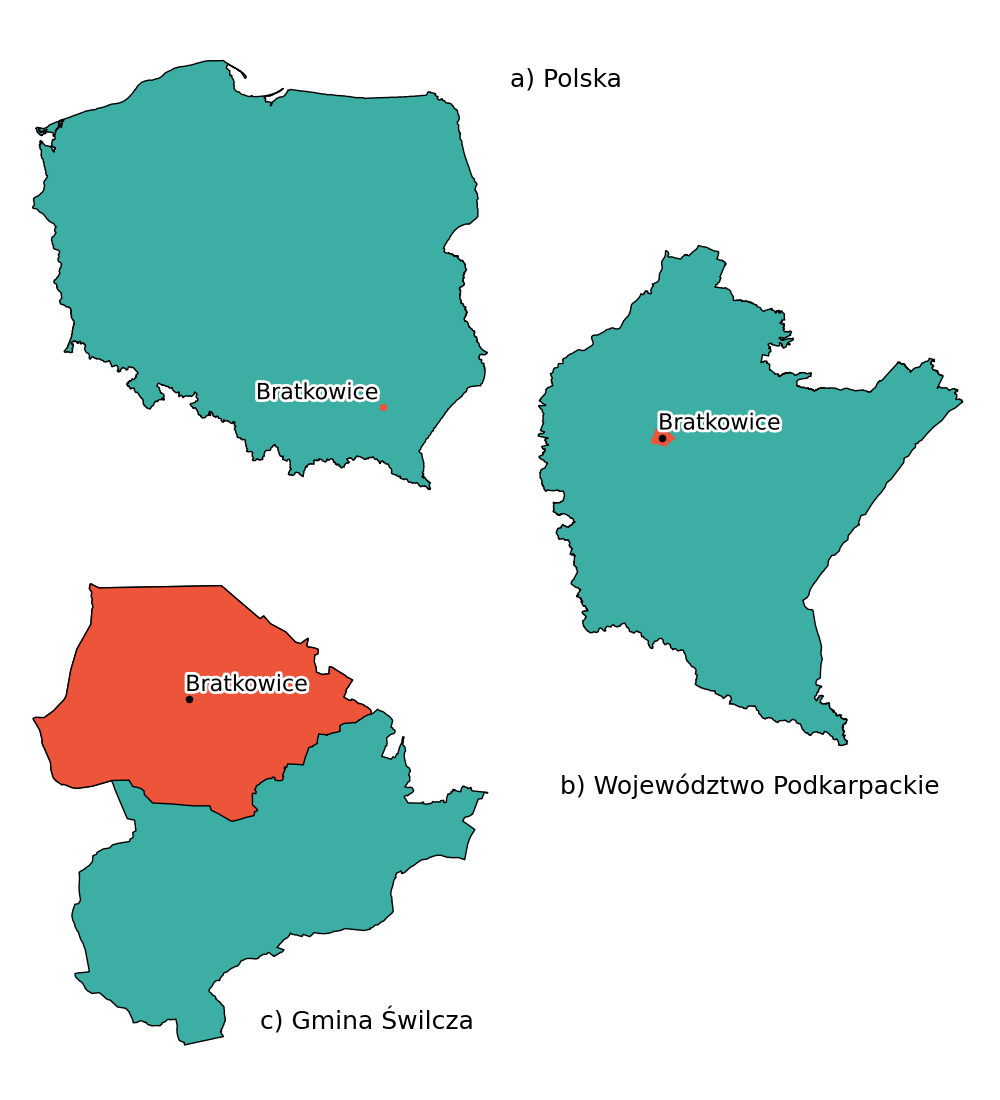 Bratkowice leżą w południowo-wschodniej części Polski, w bliskiej odległości od stolicy Województwa Podkarpackiego Rzeszowa. Należą administracyjne do gminy Świlcza. Na Rys. 2 przedstawiono położenie Bratkowic w odniesieniu do granic Polski, Województwa Podkarpackiego oraz Gminy Świlcza. Obliczona w poprzednim rozdziale powierzchnia Bratkowic stanowi $0.015\%$ powierzchni lądowej Polski, $0.263\%$ powierzchni województwa Podkarpackiego oraz aż $43.39\%$ powierzchni gminy Świlcza.