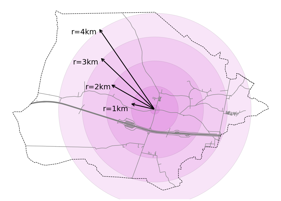 Centrum Bratkowic (nie mylić z środkiem Bartkowic) możemy utożsamić z okolicą kościoła, Szkoły Podstawowej numer 1, czy też Domu Strażaka. Przyjmijmy zatem, że punkt symbolizujący centrum Bratkowic leży w samym środku głównego skrzyżowania. Punkt ten ma zatem współrzędne geograficzne równe $50^{\circ}06^{'}56.4^{"}N 21^{\circ}51^{'}33.3^{"}E$. Wyobraźmy sobie, że jesteśmy posiadaczami ogromnego cyrkla. Jedno z jego ramion ustawiamy (wbijamy) dokładnie w centrum Bratkowic natomiast drugim ramieniem zaznaczamy okręgi o różnych promieniach, które będą oznaczać pewne strefy Rys. 9. W zależności od tego co chcemy badać strefy te mogą nam posłużyć do określenia zasięgu działania różnych czynników. Dla przykładu, wiemy, że słyszalność dzwonów kościelnych wynosi dajmy na to 3.5km przy dobrej pogodzie. W łatwy sposób możemy stwierdzić którzy mieszkańcy Bratkowic nie usłyszą ich nawoływania spoglądając na przedstawioną na Rys. 9 mapę. Podobną analizę możemy przeprowadzić rozważając zasięg sygnału alarmowego straży pożarnej.