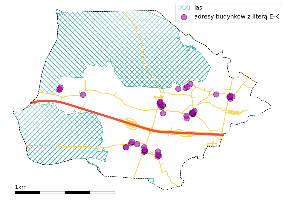 Zastanówmy się nad sposobem znalezienia miejsc w Bratkowicach, gdzie powstają nowe budynki. Jeżeli z listy dostępnych domów mieszkalnych narysujemy tylko te, które w swoim adresie zawierają litery z przedziału od E do K to powinno dać nam to czego chcemy. Dlaczego akurat takie litery ktoś zapyta? W sprawie litery K sprawa jest jasna. Jak już wspomniano to "najdalsza" litera alfabetu z którą pojawia się choćby jeden adres w Bratkowicach. Dla litery E tych adresów jest około 40. A więc zakładamy, że budynki z takimi adresami będą w miarę nowe. Wynik naszych poszukiwań został zaprezentowany na Rys. 8 gdzie punktami oznaczone zostały obliczone przez program miejsca. Będą to zatem Zapole, Krzaki (przy lesie), domy wzdłuż drogi biegnącej blisko autostrady z Sitkówki w stronę Mrowli oraz Skworcza. To w tych miejscach powstają nowe zabudowania.