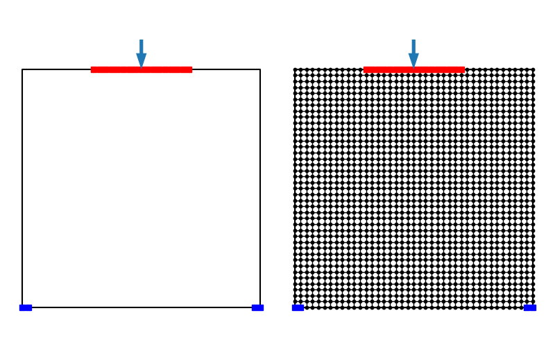$$\ss = \mat{ \sigma_{11} }{ \sigma_{12} }{ \sigma_{13} }{ \sigma_{21} }{ \sigma_{22} }{ \sigma_{23} }{ \sigma_{31} }{ \sigma_{32} }{ \sigma_{33} }= \mat{ \sigma_{11} }{ \sigma_{12} }{ 0 }{ \sigma_{21} }{ \sigma_{22} }{ 0 }{ 0 }{ 0 }{ 0 }\quad \rightarrow \quad \ss = \matt{ \sigma_{11} }{ \sigma_{12} }{ \sigma_{21} }{ \sigma_{22} }$$Rozwiążmy z użyciem biblioteki CALFEM problem ściskania tarczy swobodnie podpartej obciążonej siłą w środku rozpiętości. Zakładamy że matereriał jest sprężysty i izotropowy. Interesuje nas analiza statyczna. Nasze obliczenia prowadzimy w opariuc o teorię małych odkształceń.