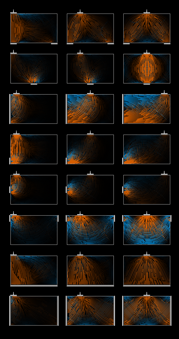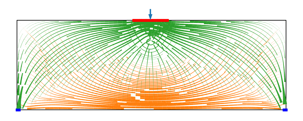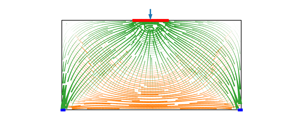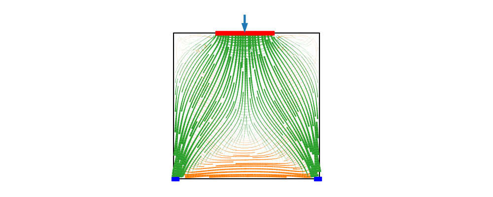 Rozwiązując przedstawione zagadnienie otrzymujemy pole przemieszczenia, które w dalszej kolejności mozemy przeliczyć na pole odkształcenia a następnie używajć zwiazku konstytutuwynego mozemy wyznaczyć pole naprężenie. Jak już wspomniano stan naprężenia w danym punkcie będzie reprezentowany przez 4 składowe. Z uwagi na to że tensor naprężenie jest symetryczne 3 składowe będą niezależne. Dla każdego tensora mozemy rozwiązać zagadnienie własne (wyznaczyć kierunki i wartosci własne). Na poniższych rysunkach przedstawiono wizualizację uzyskanych pól skalarno-wektorowych. Zielone linie i ich grubość odpowiada ujemnym wartosciom własnym i odpowiadajacym im wektorm własnym (ściskanie). Z kolei kolor pomarańczowy oznacza dodatanie wartosci własne i odpowiadajace im wektory własne.