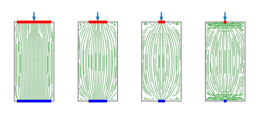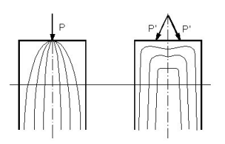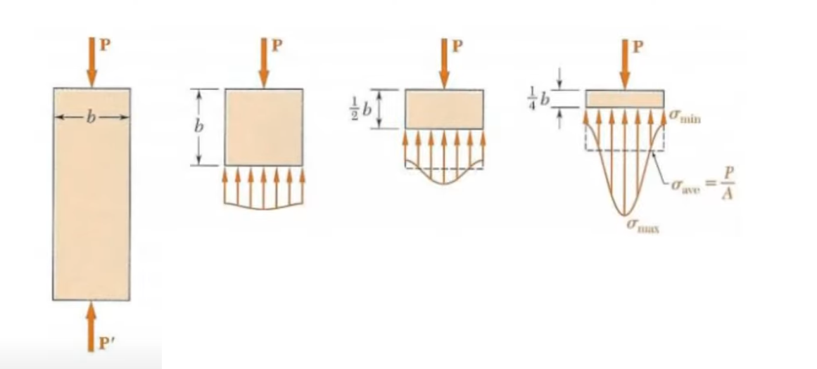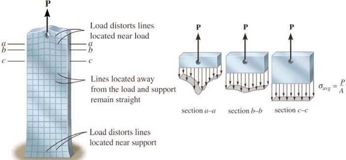 Zgodnie z zadadą Saint Venanta, gdy dwa różne układy sił o tej samej wypadkowej działają na mały obszar ciała, wywołują takie same stany naprężenia w całym ciele, z wyjątkiem bezpośredniego otoczenia przyłożonych sił. Jak pokazuje rysunek, dwie siły rozciągające działają symetrycznie w stosunku do siły ściskającej dają w dalszym otoczeniu podobny stan naprężenia.
