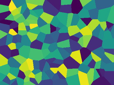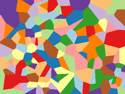 Bardzo prosty algorytm do wyznaczania komórek Voronoia. Komórki znajdowane są na podstawie odległości wyznaczanych między losowo rozmieszczonymi punktami. W kodzie używania jest funkcja hypot.