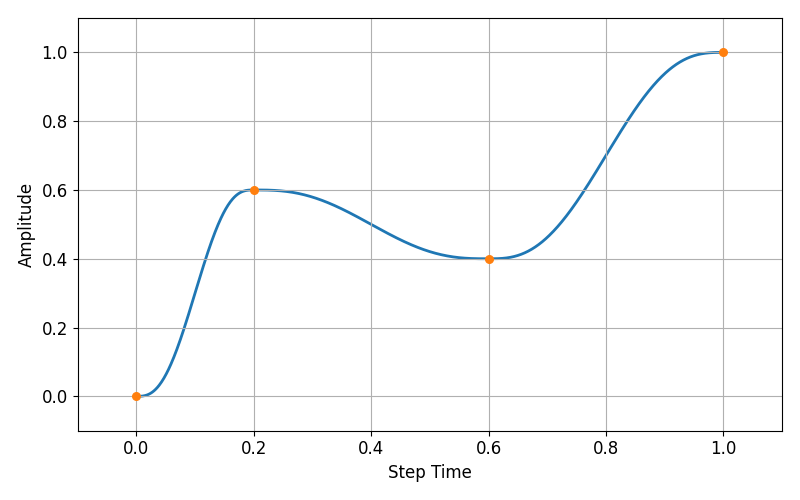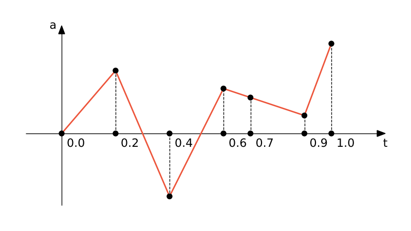 An example of an amplitude function depending on time. Abaqus interpolates linearly between each time interval