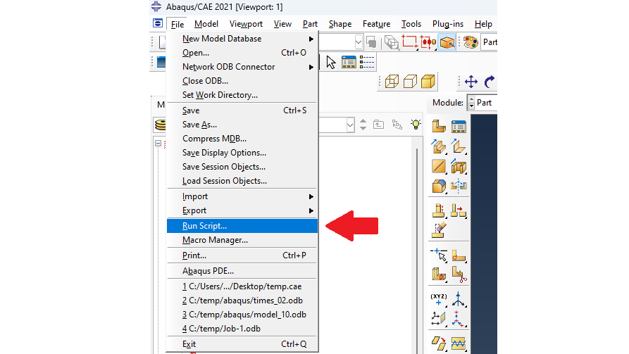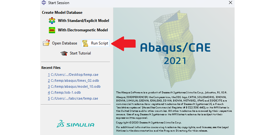 • Running a script from the startup screen. When you start an Abaqus/CAE session, Abaqus displays the startup screen. You can run a script from the startup screen by clicking Run Script.