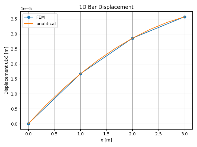 Boundary conditions are applied to fix the left end of the bar, ensuring zero displacement at that node. The system of equations K * a = f is solved using the CALFEM solver, which returns the nodal displacements a and the reaction forces r at the constrained node. These results provide the primary solution for the bar’s deformation under the given loading conditions.