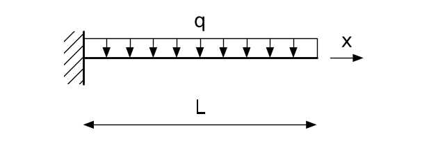 A cantilever beam is given, made of a material with stiffness $E$ and a cross-section whose moment of inertia is equal to $I$. The beam is subjected to a distributed load $q(x)$. The beam is fixed at the beginning.