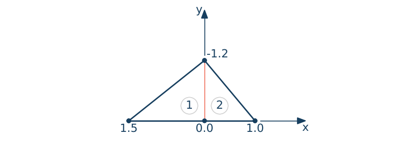 $$\X = \begin{bmatrix}0.0 & 0.0 \\ 1.0 & 0.0 \\ 0.0 & 1.5\\ \end{bmatrix} ,\qquad \Y = \begin{bmatrix} 0.0 & 0.0 \\ 0.0 & 1.2 \\ 1.2 & 0.0\\ \end{bmatrix}$$Oblicz następując całkę wykorzystując podział obszaru na jeden trójkąt.