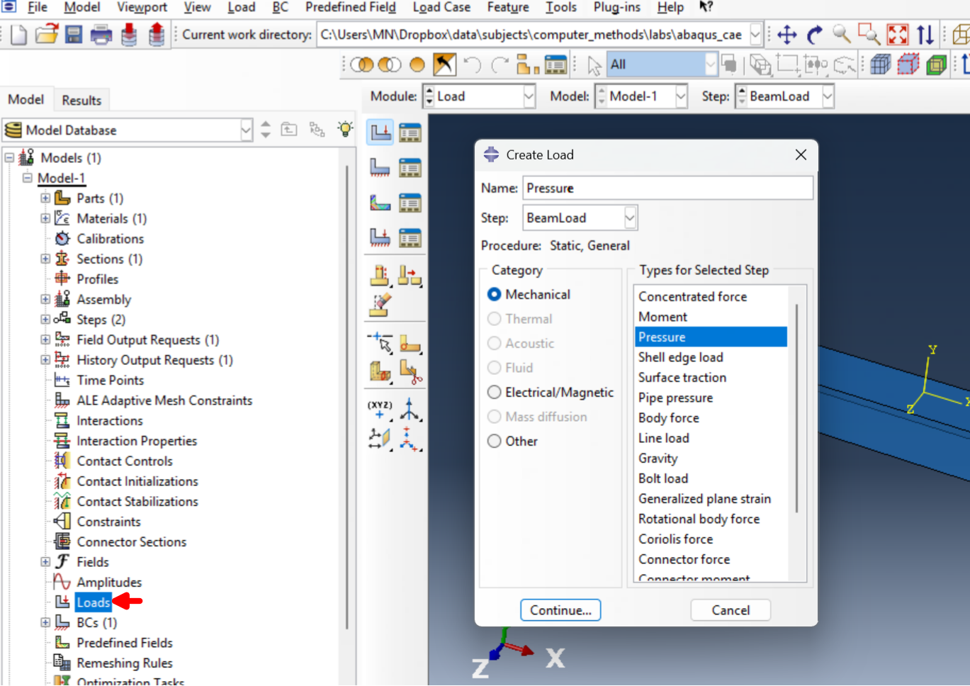 Aby zadać obciążenie w postaci ciśnienia w Model Tree kliknij dwukrotnie Loads. W oknie Create Load ustaw: