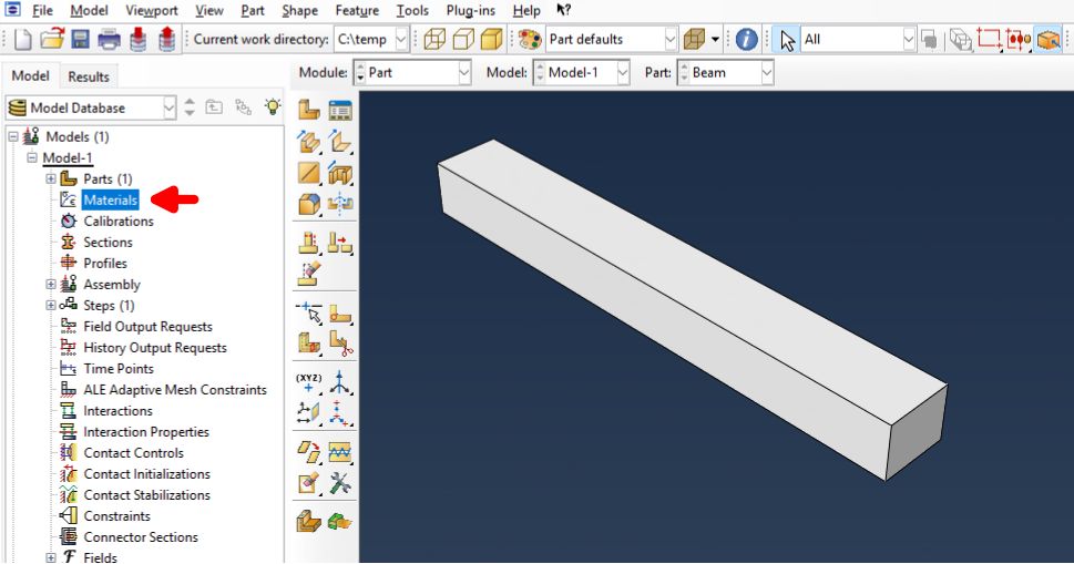Aby utworzyć materiał z którego wykonana jest nasza belka należy w Model Tree kliknąć dwukrotnie Materials