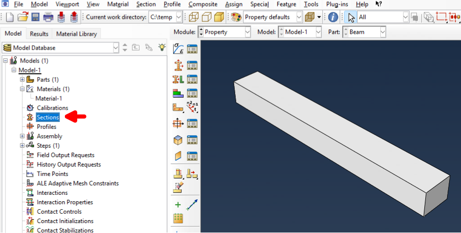 Celem tego kroku jest przypisanie materiału do stworzonej geometrii. W Model Tree kliknij dwukrotnie Sections