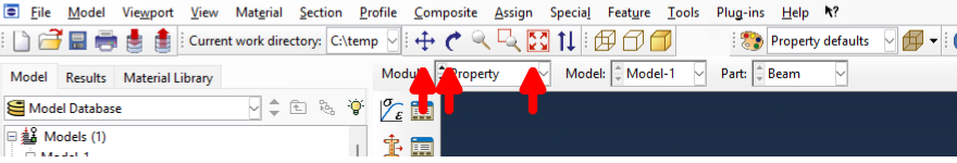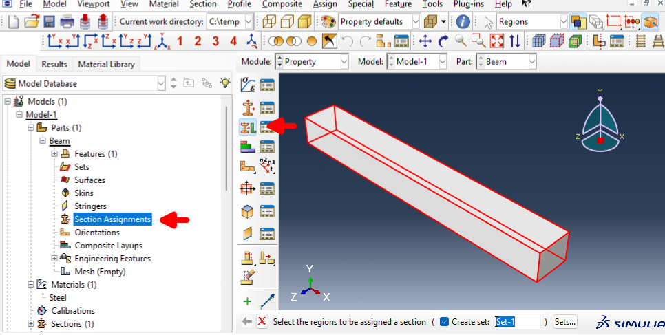 W Model Tree rozwiń: Parts → Beam i kliknij dwukrotnie Section Assignments lub w pasku narzędzi kliknij Assign Section