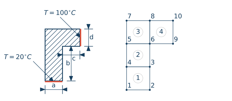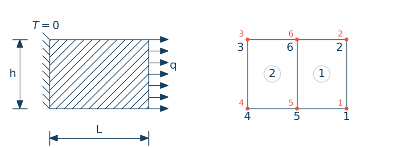 Rozważmy bardzo proste zagadnie przypływu ciepła w dwóch wymiarach. Lewa krawędź tarczy ma ustalona temperatur $T=0$, natomiast prawa krawędź ma zaday strumień ciepła $q$.