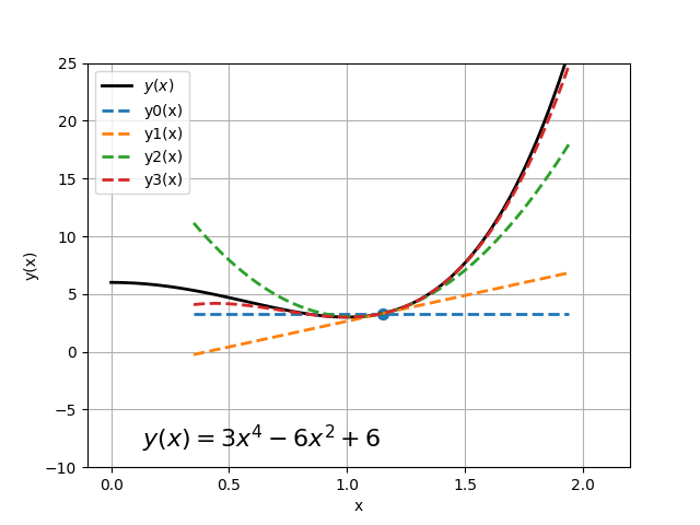 $$f(x+h) \approx f(x) + \cfrac{df(x)}{dx}h$$Sprawdźmy jak wygląda przybliżenie funkcji $y(x)$ w zależności od liczby wyrazów szeregou Taylora oraz od wielkości kroku $h$ w otoczeniu punktu $x=1.2$. Widzimy, że dla dużych $h$, rozwiązanie nie jest dokładne. Ta sama zależność ma miejsce wraz ze zmniejszaniem się liczby wyrazów szeregu.