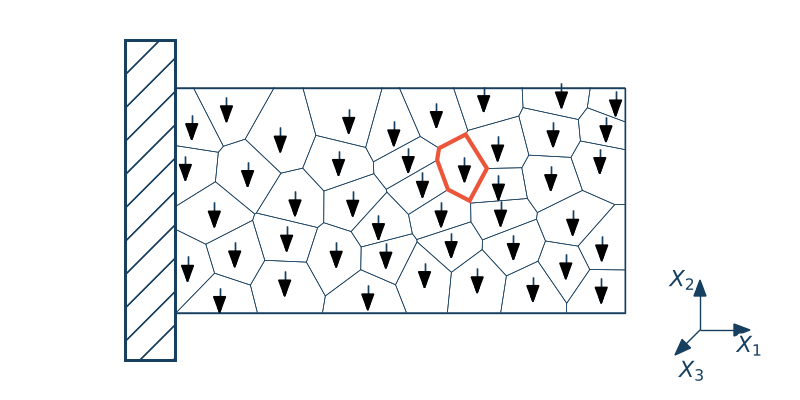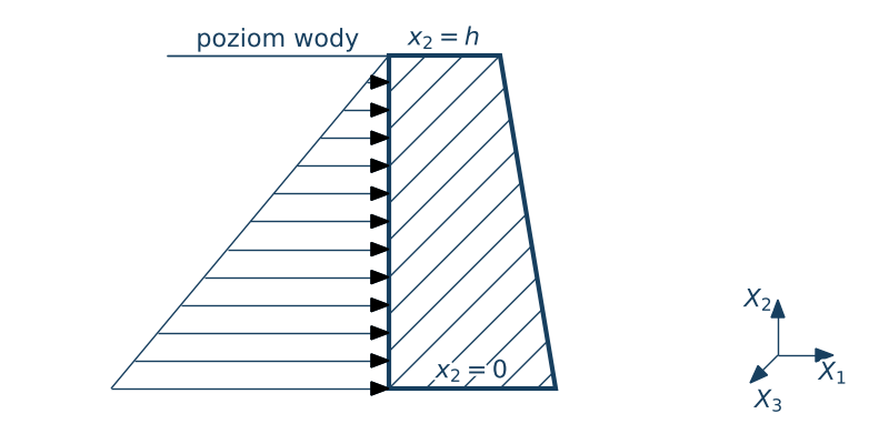 $$\q(\x) = \vr{\rho g (h-x_2)}{0}{0}$$• Siły wewnętrzne. Zakładamy istnienie sił wewnętrznych – przekonuje nas o tym fakt, że cząstki wewnątrz ciała poruszają się (zachodzi odkształcenie ciała), z reguły każda w nieco inny sposób. Rozkład sił wewnętrznych opisany zatem będzie za pomocą wektorowej funkcji gęstości wewnętrznych sił powierzchniowych $\t(\x ,\n , t)$