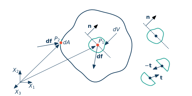 $$\t(\x, \n, t) = \lim_{\Delta A\ \rightarrow 0}\cfrac{\Delta\f}{\Delta A} = \cfrac{d\f}{dA}$$Funkcja gęstości wewnętrznych sił powierzchniowych jest polem wektorowym. Wektor ten nazywać będziemy wektorem naprężenia w danym punkcie przy cięciu powierzchnią o normalnej $\n$. Wektor naprężenia $\t$ jest przyporządkowany elementowi $dS$ o konkretnej normalnej $\n$.