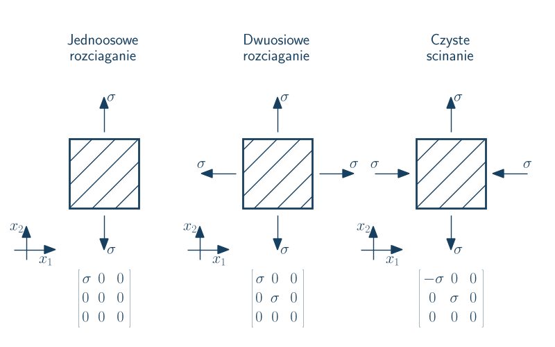 $$\ss = \mat{\sigma}{0}{0}{0}{0}{0}{0}{0}{0}$$Dwuosiowe rozciąganie oznacza, że naprężenia normalne działają jednocześnie w dwóch kierunkach, np. wzdłuż osi $x_1$ i $x_2$. Przykładem może być płyta rozciągana w dwóch kierunkach równocześnie. Tensor Cauchy'ego w tym przypadku ma postać: