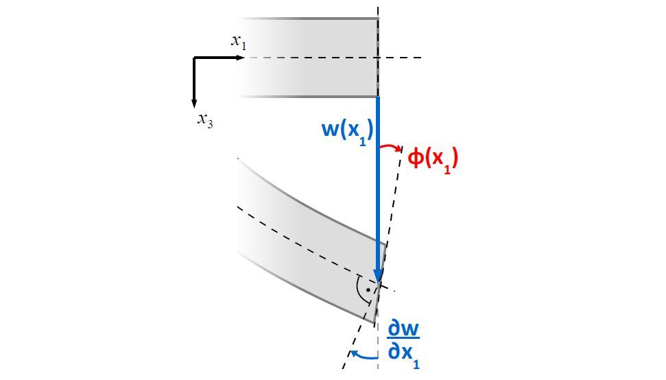 • Ugięcie i rotacja przekroju: Przekrój poprzeczny belki po deformacji może nie być prostopadły do zdeformowanej osi belki. W modelu Timoszenki zakłada się, że przekrój może obracać się o pewien kąt $\phi$, co oznacza, że nie pozostaje on prostopadły do osi neutralnej, ale nadal zachowuje swoją płaskość.