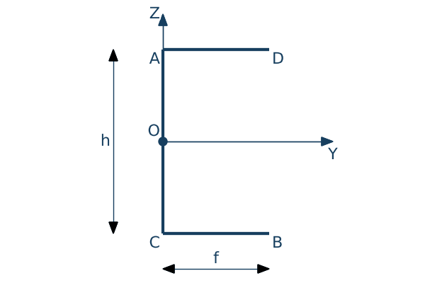 $$y_R = -\cfrac{I_{\omega z}}{I_y} + y_B, \qquad z_R = -\cfrac{I_{\omega y}}{I_z} + z_B$$Wyznacz położenie środka zginania dla profilu ceowego jak na rysunku. Grubość ścianki wynosi $\delta=0.1cm$ a pozostałe wymiary odpowiednio $h=6cm$ i $f=3cm$.