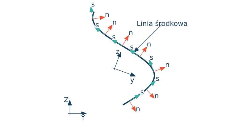 • lokalny $(x, s, n)$ krzywoliniowy układ ortogonalny którego pierwsza oś jest równoległa do osi $x$, druga oś jest styczna do linii środkowej a trzecia wyznacza wektor prostopadły to pierwszych dwóch osi.