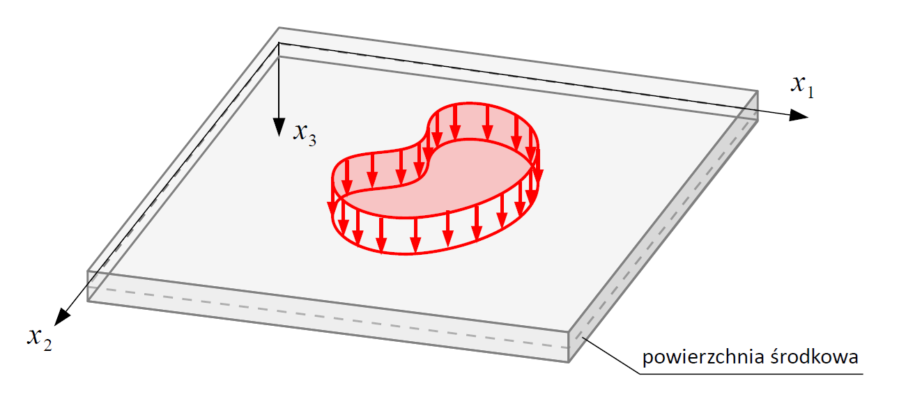 $$\pp{^4 w(x_1,x_2)}{x_1^4} + 2\pp{^4 w(x_1,x_2)}{x_1^2 \partial x_2^2} + \pp{^4 w(x_1,x_2)}{x_2^4} = \cfrac{q(x_1,x_2)}{D}$$gdzie $q(x_1,x_2)$ to zewnętrzne obciążenie działające na powierzchnię płyty $[N/m^2]$, a $D$ opisuje sztywność giętną płyty wyrażone zależnością