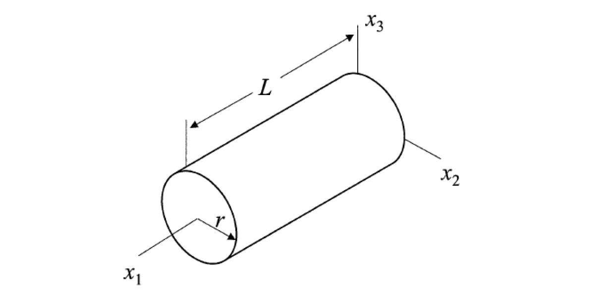 $$[\sigma_{ij}] = \left[ \begin{array}{ccc} Ax_2+Bx_3 & Cx_3 & -Cx_2\\ Cx_3 & 0 & 0\\ -Cx_2 & 0 & 0\\ \end{array} \right]$$Sprawdź czy przy braku sił objętościowych i pominięciu wpływu sił bezwładności równanie równowagi jest spełnione. Pokaż, że wektor naprężenia jest równy $\mathbf{0}$ dla wszystkich punktów leżących na powierzchni bocznej walca.
