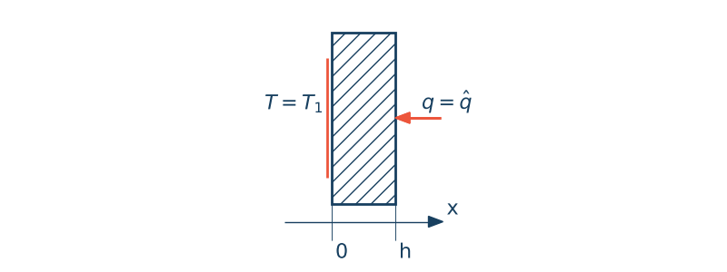 Zapisz i rozwiąż równanie różniczkowe opisujące jednowymiarowy przepływ ciepłą dla materiału jednorodnego. Przepływ jest ustalony, brak jest wewnętrznych źródeł ciepła. Warunki brzegowe zdefiniowane są zgodnie z rysunkiem.