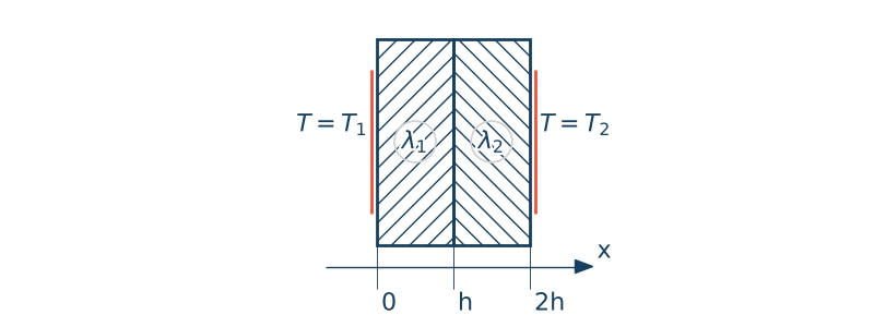 Wyznacz rozkład temperatury $T(x)$ dla jednowymiarowego zaganienia przepływu ciepła. Przepływ ciepła jest ustalony. Brak jest wewnętrznych źródeł ciepła. Analizowana przegorda termiczna składa się z dwóch jednorodnych materiałów o współczynnikach przewodzenia ciepła równych $\lambda_1$ oraz $\lambda_2$.