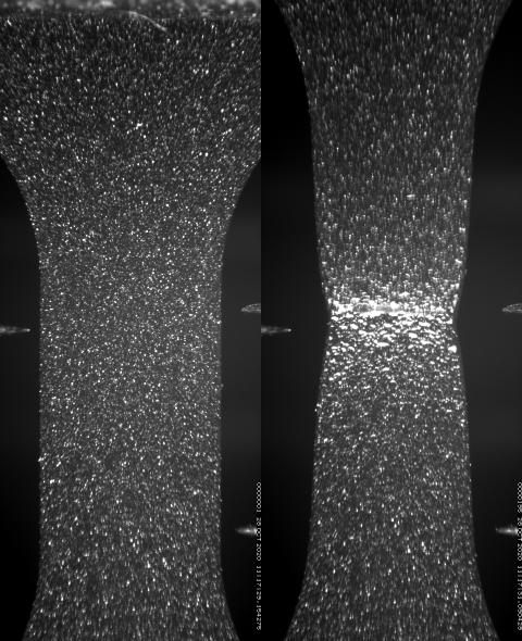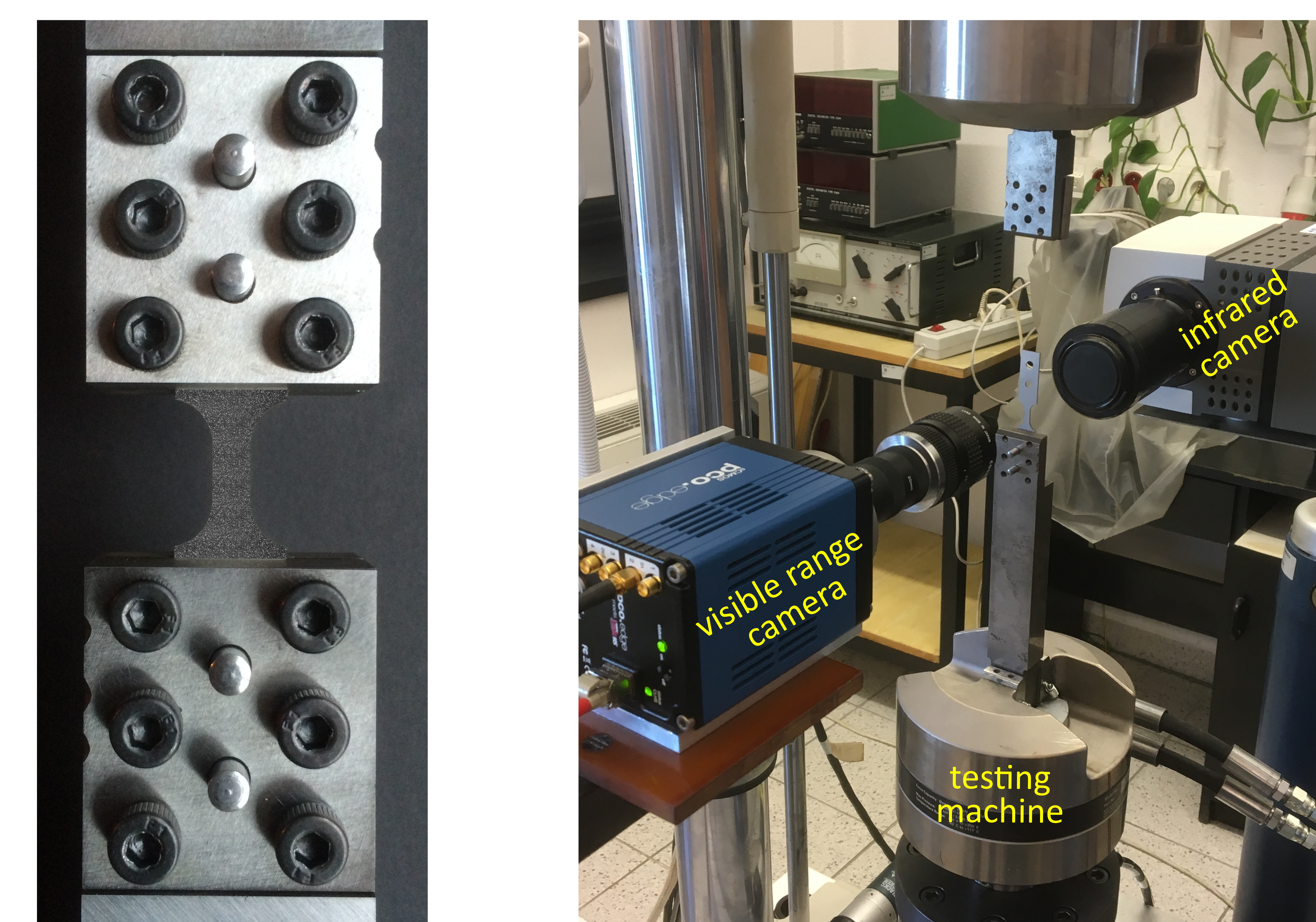 Uzyskane podczas eksperymentu przebiegi czasowe siły $F$ oraz wydłużenia $u$ zostały przeliczone na odpowiednie miary naprężenia i odkształcenia