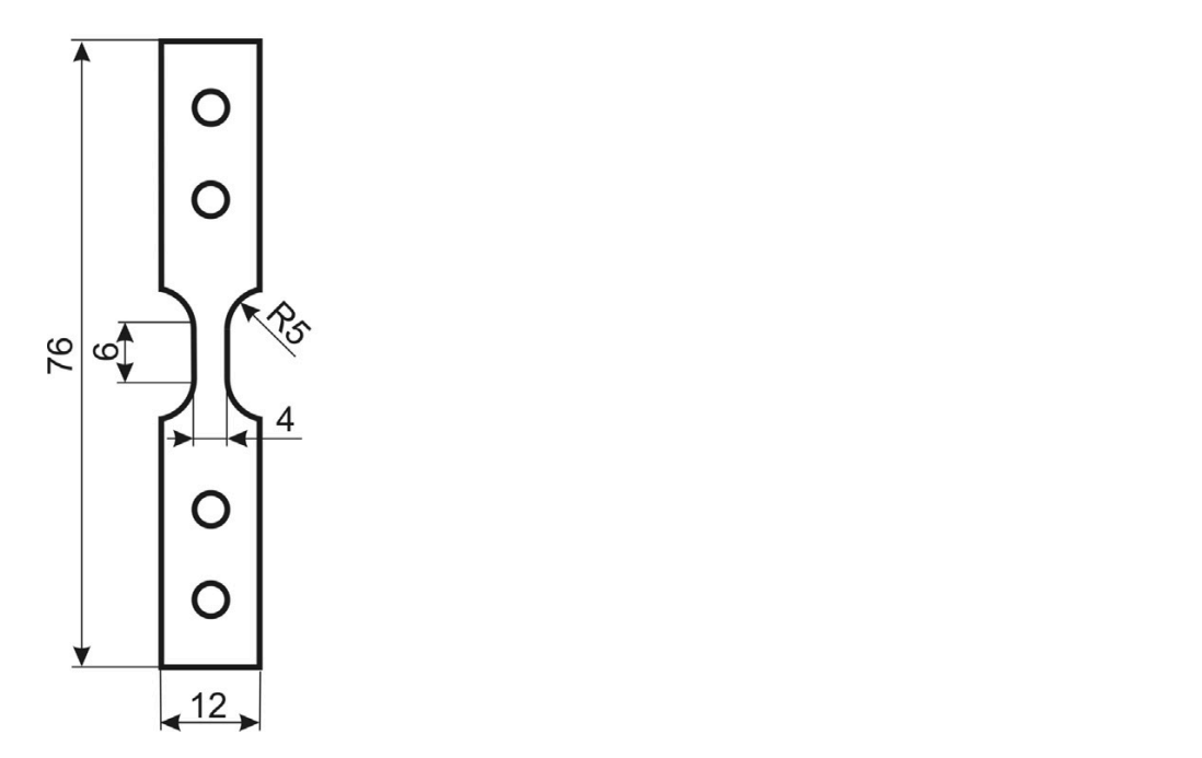 W eksperymencie użyta została łaska próbka typu "dog bone". Grubość próbki wynosi 0.8mm. Geometria próbki wraz z podstawowymi wymiarami została przedstawiona na poniższym rysunku.