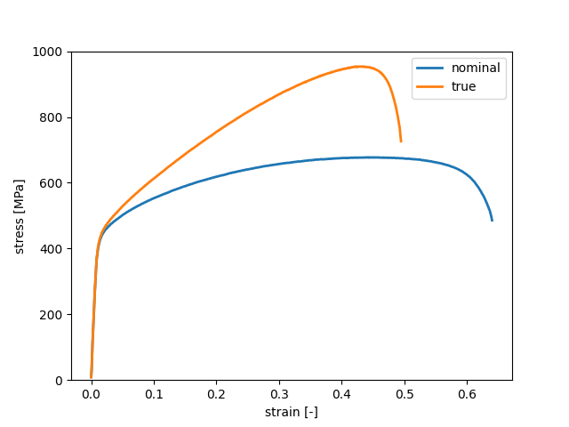 $$\sigma_{n} = \cfrac{F}{A_0}, \qquad \varepsilon_{n} = \cfrac{u}{L_0}$$gdzie $A_0$ to początkowe pole przekroju poprzecznego próbki w połowie długości, $L_0$ to przyjęta długość bazowa dla której mierzy się względnie przemieszczenie $u$. Wartości nominalne przeliczono na wartości rzeczywiste stosując następujące formuły