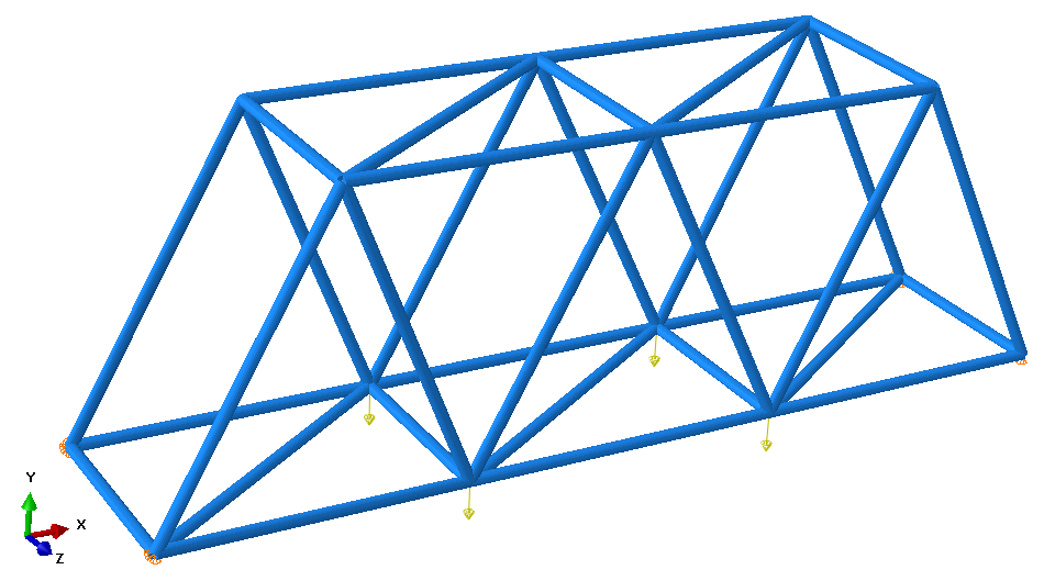 Ćwiczenia polega na zaprojektowaniu prętowej konstrukcji kratowej z użyciem trójwymiarowych elementów skończonych T3. Elementy tego typu pracują wyłącznie na rozciąganie lub ściskanie. Posiadają 6 stopni swobody (po trzy w każdym węźle). Każdy pręt kratownicy (między jej węzłami) traktujemy jako jeden element skończony. Siły w kratownicy możemy przykładać jedynie do jej węzłów. Ze względu na to że pręty przenoszą jedynie siły osiowe nie ma znaczenia kształt przekroju poprzecznego tych prętów. Znaczenie ma jedynie pole powierzchni.