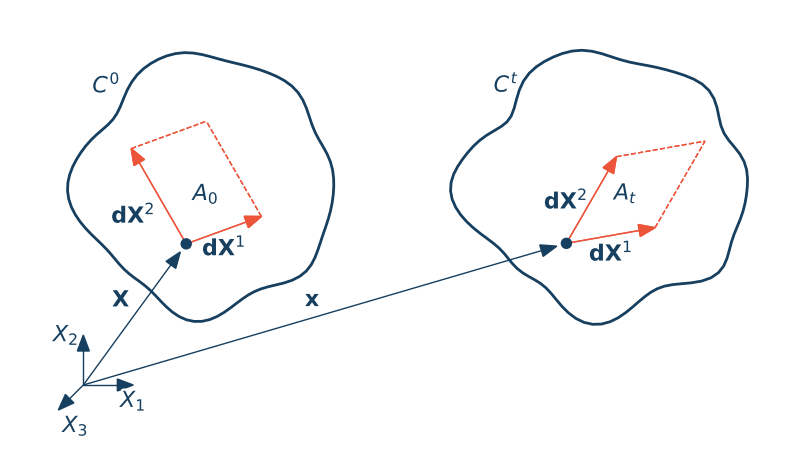 Rozważmy dwie konfigurację ciała. $C_0$ konfiguracja początkowa oraz $C_t$ konfiguracja aktualna po deformacji. Oznaczmy dwa elementarne wektory w konfiguracji początkowej i aktualnej na których rozpięte są równoległoboki o polach odpowiednio $A_0$ - konfiguracja początkowa oraz $A_t$ - konfiguracja aktualna.