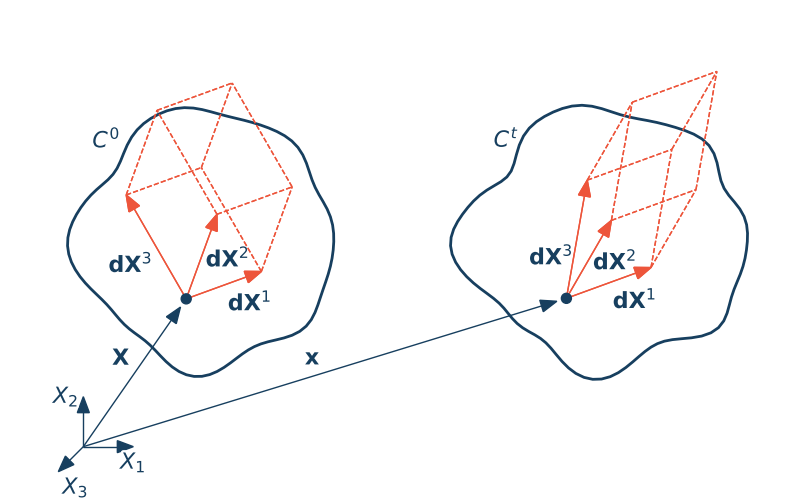 Rozważmy dwie konfigurację ciała. $C_0$ konfiguracja początkowa oraz $C_t$ konfiguracja aktualna po deformacji. Oznaczmy trzy elementarne wektory w konfiguracji początkowej i aktualnej na których rozpięte są równoległościany o objętościach odpowiednio $V_0$ - konfiguracja początkowa oraz $V_t$ - konfiguracja aktualna.