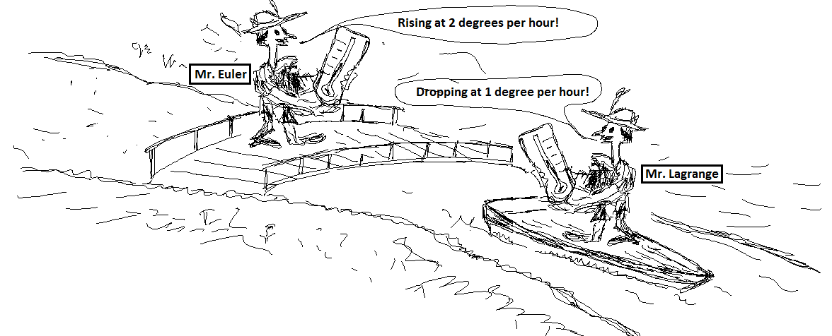Imagine two people, Mr. Euler and Mr. Lagrange, making temperature observations in order to calculate the rate at which the temperature is varying. Mr. Euler is standing on a bridge, while Mr. Lagrange is in a boat carried by a river, as shown in the figure. When the boat passes the bridge, they discover that their observed rates differ. Why? This happens because the temperature differs in different locations on the ground. To calculate the rate, they divide the difference between the two observed temperatures by the time interval between the measurements. Even if one of the measurements was made when the boat was passing the bridge, the other measurement was when the boat was away from the bridge. Then, even if they took this other measurements at the same instant, the results can differ. In the example with the boat it was assumed that the boat was carried by the fluid, that is, it was moving with the velocity of the fluid itself. The Eulerian viewpoint consists in considering quantities as dependent on time and point in space. The Lagrangian viewpoint consists in considering quantities as dependent on time and the fluid particle. Lagrangian viewpoint is particularly useful when the laws of fluid motion are derived from the Newton laws. Once derived, however, these laws are more convenient to use from the Eulerian viewpoint.